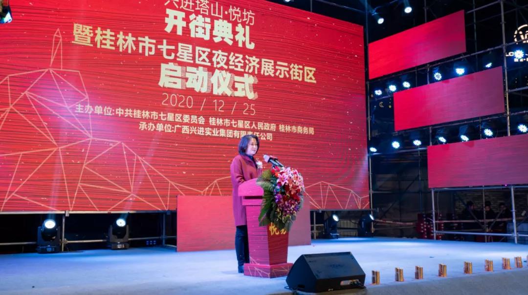 在現(xiàn)場(chǎng)熱烈氛圍下,七星區(qū)人民政府鄭平區(qū)長(zhǎng)上臺(tái)擔(dān)任此次啟動(dòng)儀式的嘉賓主持,她表示悅坊開(kāi)街標(biāo)志著塔山片區(qū)城中村?棚戶(hù)區(qū)改造項(xiàng)目建設(shè)再次取得新突破,也將對(duì)激活七星區(qū)夜間消費(fèi)市場(chǎng)、助力桂林國(guó)際旅游勝地建設(shè)、填補(bǔ)區(qū)域文旅娛樂(lè)產(chǎn)業(yè)發(fā)展空白,產(chǎn)生重要影響。