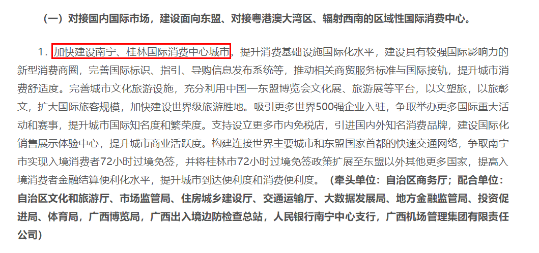 近日,自治區(qū)政府辦公廳印發(fā)《廣西打造國(guó)內(nèi)國(guó)際雙循環(huán)重要節(jié)點(diǎn)樞紐行動(dòng)方案》中提出工作任務(wù):加快建設(shè)南寧、桂林國(guó)際消費(fèi)中心城市,建立完善廣西直供粵港澳大灣區(qū)、長(zhǎng)江經(jīng)濟(jì)帶的供應(yīng)鏈。