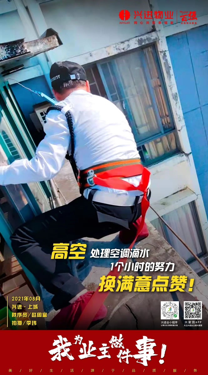 興進·上城物業(yè)秩序班長李瑋與隊員趙周富,頂著一個多小時的烈日,汗流浹背地幫助業(yè)主更換空調(diào)冷凝排水管;