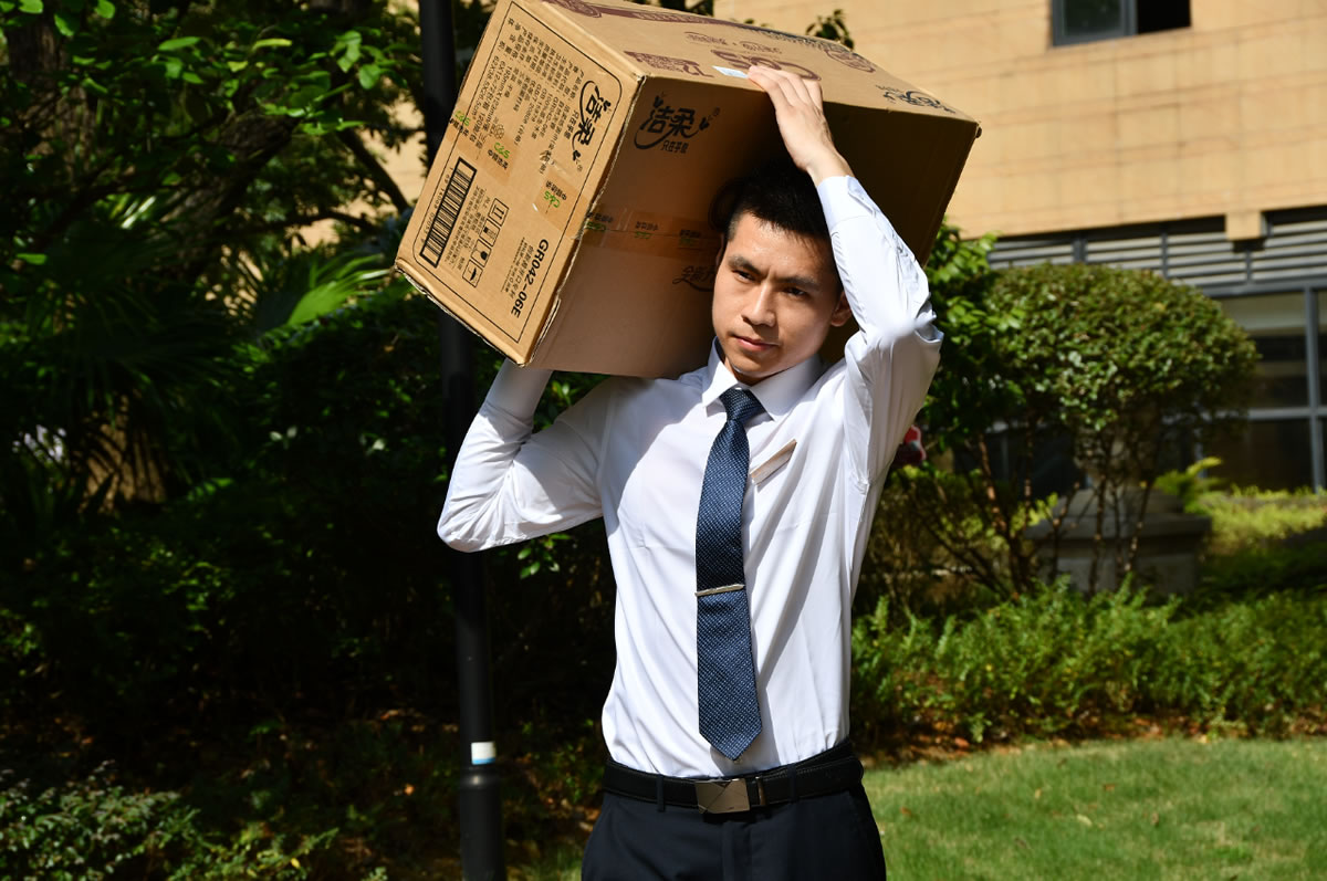 興進·上譽物業(yè)秩序班長穆華坤和隊員張學(xué)、秦串林在正午炙熱的太陽下,幫助業(yè)主搬運重達60公斤的冰箱至頂層閣樓……