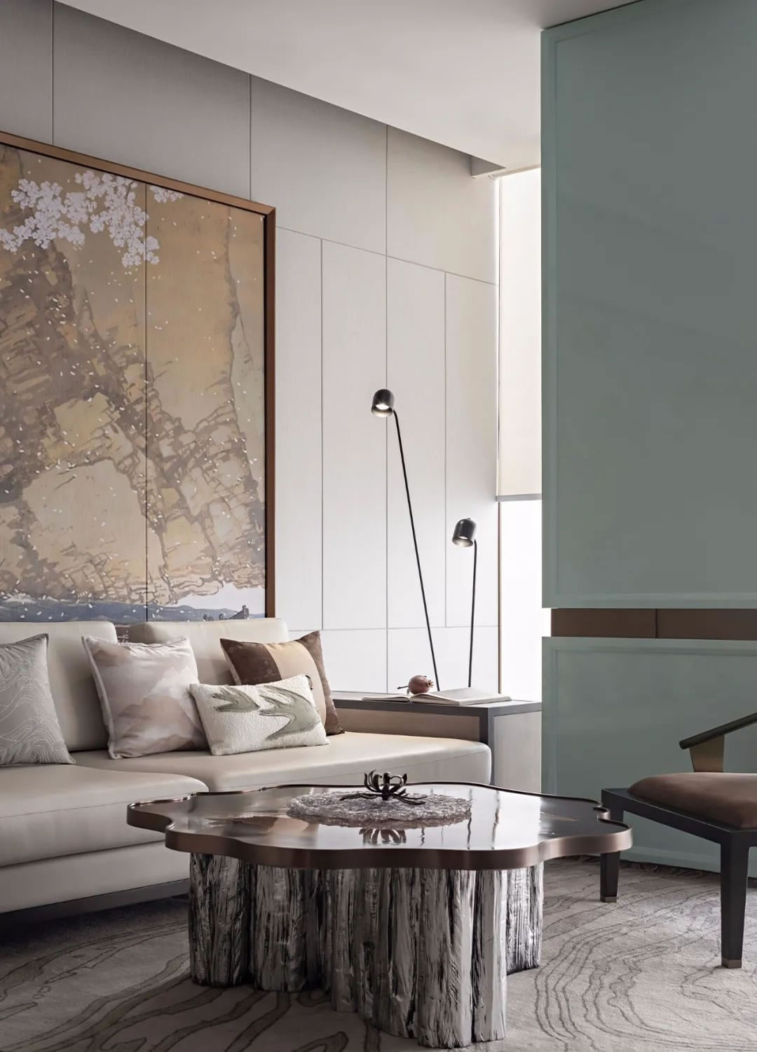 客廳丨東方美學的空間語言更在于一種體驗式的感受,情緒如果它的精神特質(zhì),在規(guī)整的布局,落地的光影,素雅的色彩,細節(jié)的紋理中都能呼之欲出,讓視覺的思維可以毫無阻礙的,架構(gòu)出一副落筆成軸的畫卷,澄凈通透,美不勝收。