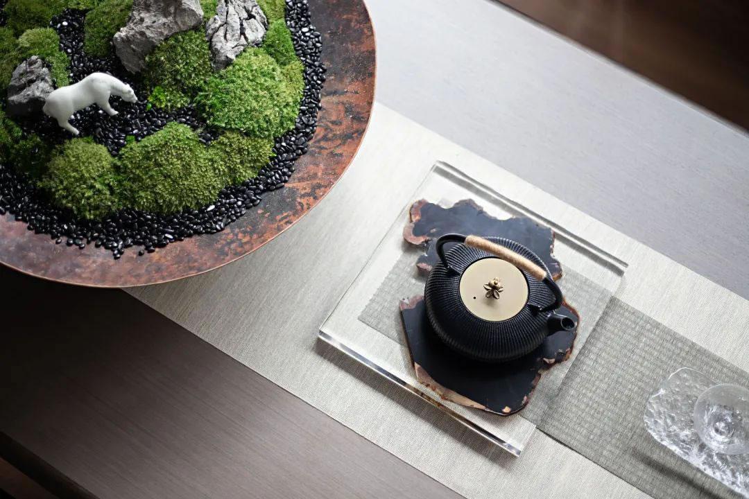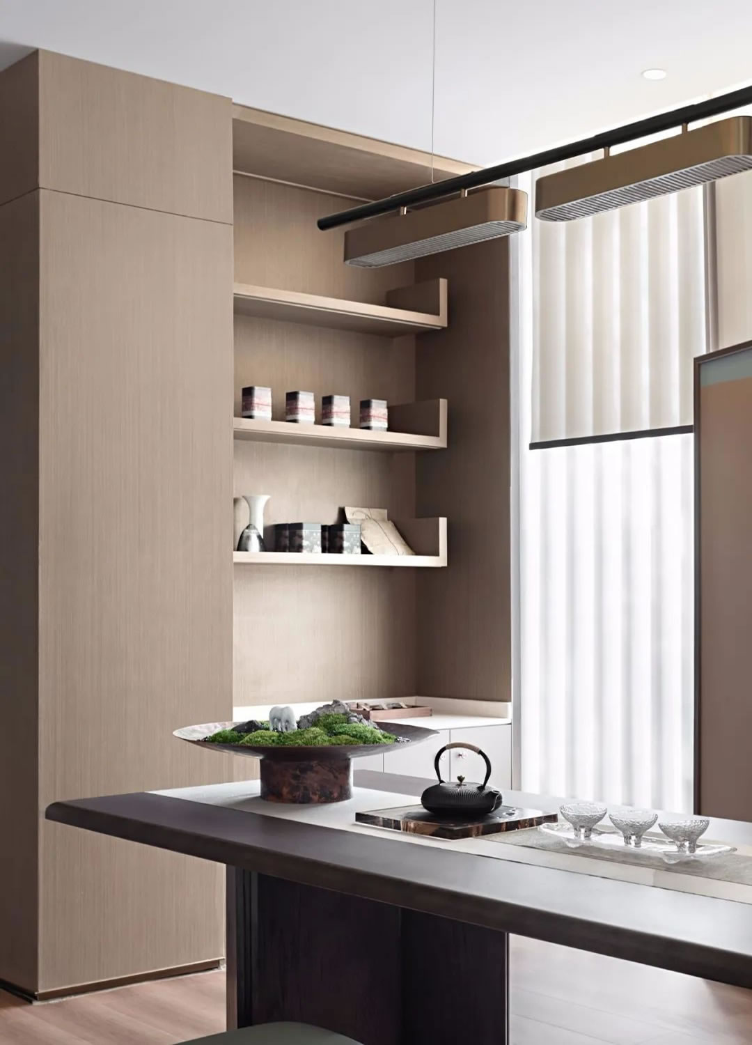 茶室丨茶是人與自然溝通的媒介之一,在空間的木質(zhì)肌理和愜意的案幾置景之上,紙與墨的暢意揮灑,盆與植的合二為一,更有雅致的茶器,醇和的茶香,給午后閑暇的小憩一隅輕松的舒暢,在推杯換盞中品味生活,回味時光。