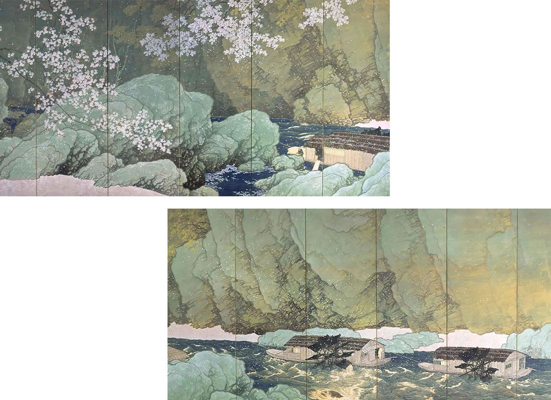《分卡的春天》河合G子丨峽谷中的河流被花瓣包圍,幾葉扁舟順流而下,藝術(shù)家特別注意水的運動與環(huán)境的氛圍。