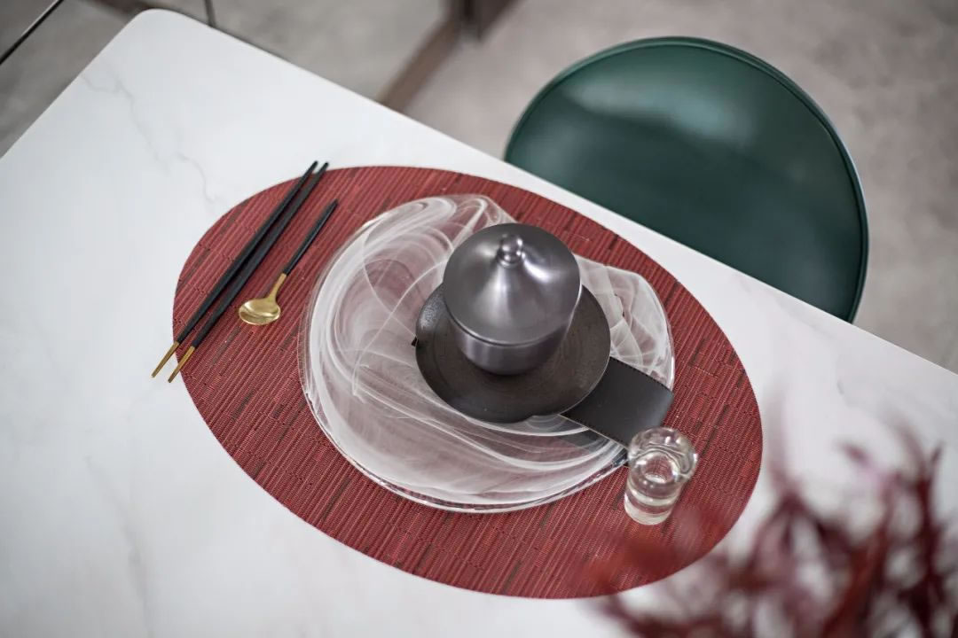 餐廳丨朱砂紅的色彩過渡讓餐廳的空間如同一場沉浸式的靈感釋放,一副寫意的畫作,解構(gòu)了傳統(tǒng)用餐場景的通俗關(guān)系,一隅陳設(shè)的案幾,賦予了空間儀式的意境,一杯一盞都是極具張力的文化渲染。