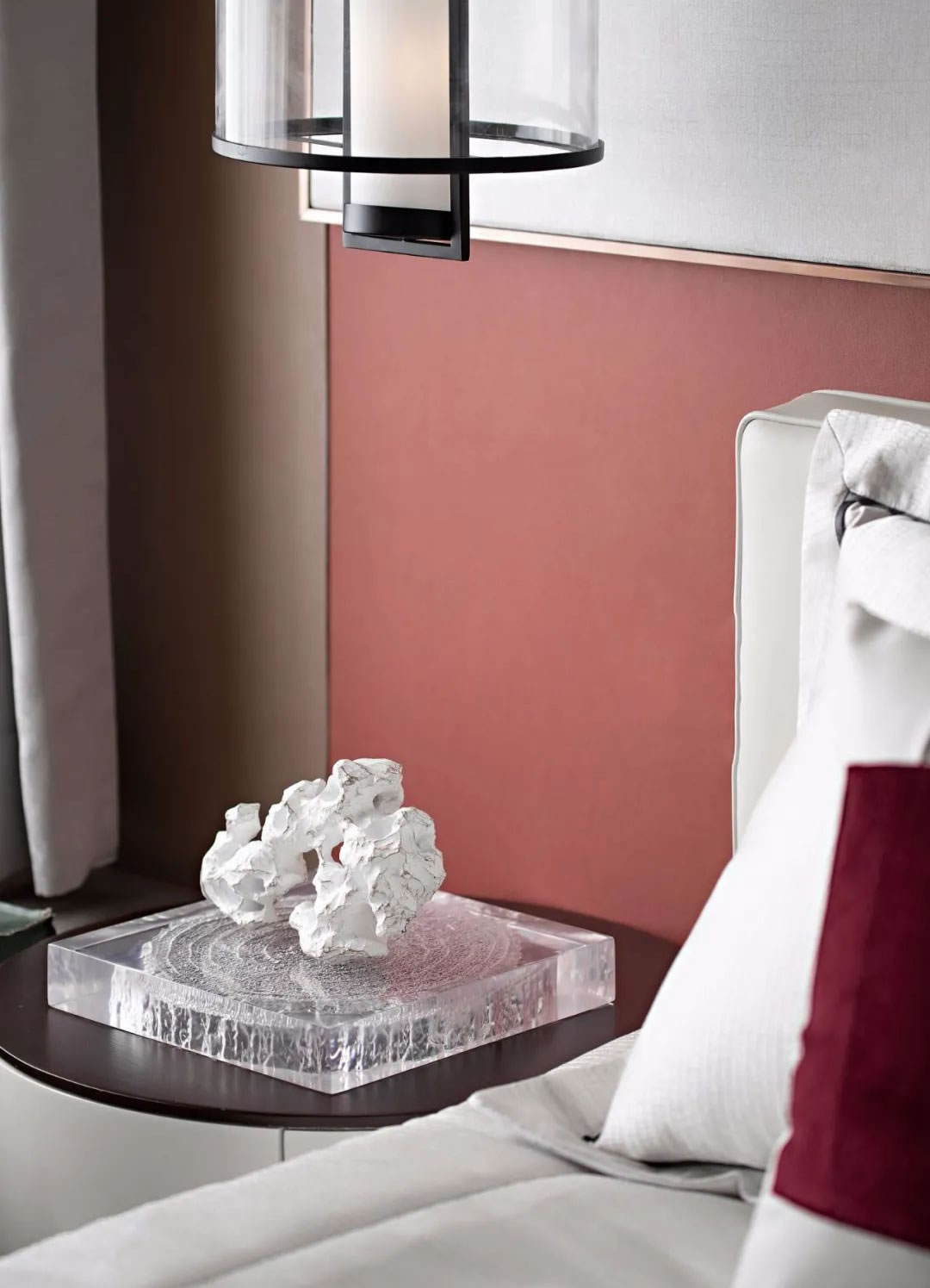 臥室丨朱砂紅的色彩格局在主臥的視野中蔓延開來,而松石綠如同點睛之筆,將場景暈染出情緒色彩,床頭那一尾禪靜的壘石,柜面那一抹楓葉的彩染,窗欞那一場愜意的品茗,或靜或動,或定或閑,讓生活既是景中畫,也是畫中景。