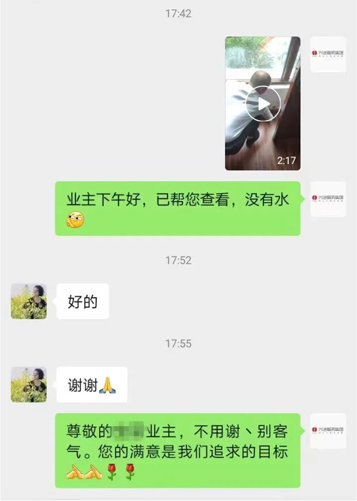 漓江郡府業(yè)主因去外地出差,特囑托物業(yè)管家照看。在暴雨來臨時,物業(yè)管家及時為業(yè)主檢查門窗是否關(guān)好,窗戶陽臺是否有飄雨等情況,并發(fā)送檢查視頻讓業(yè)主了解到家中的實時信息,業(yè)主非常安心和滿意。急業(yè)主之所急,想在前,行動為先,業(yè)主住的安心是興進物業(yè)的不懈追求。
