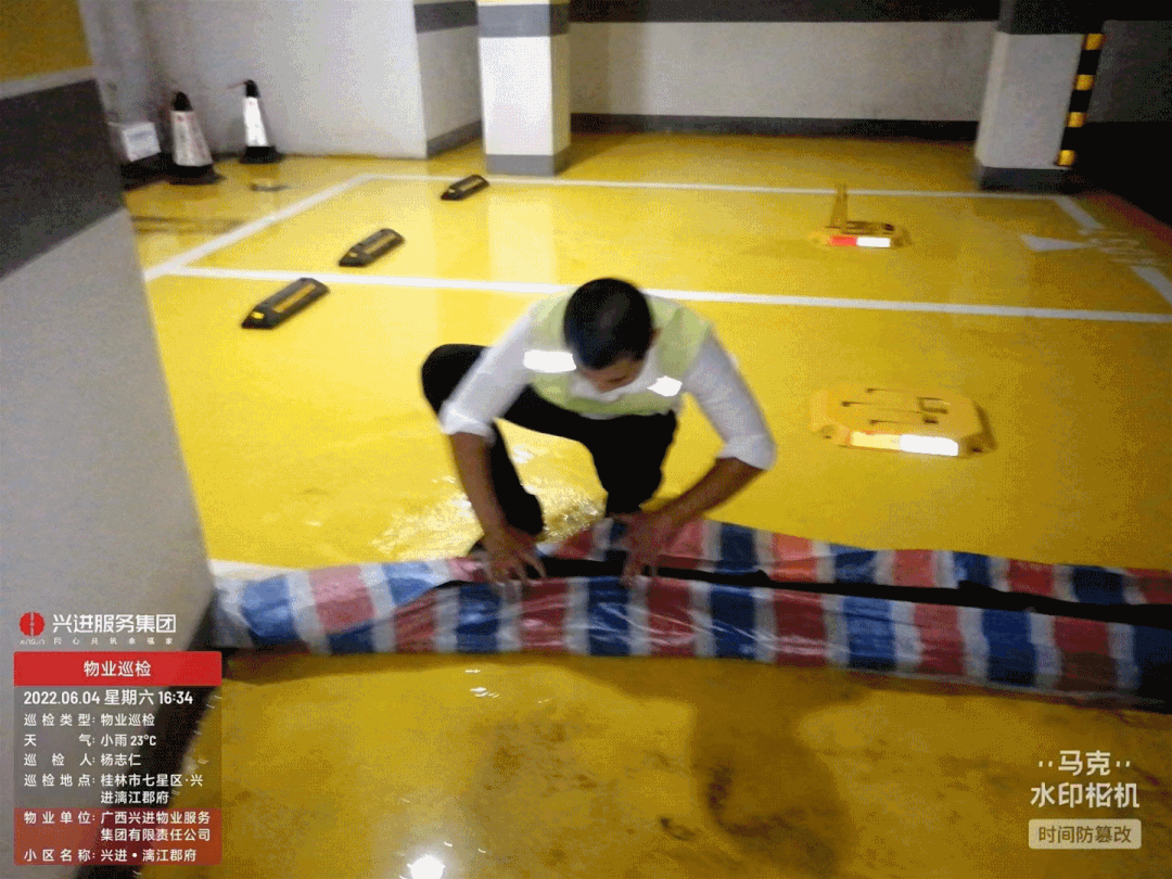 興進·漓江郡府第一時間做好防洪措施,檢查各地下室抽水泵、易澇處、出入口、天臺等多方位加強檢查巡邏,丹桂府地下易積水處采取沙袋隔離等措施,確保地下無積水。