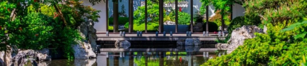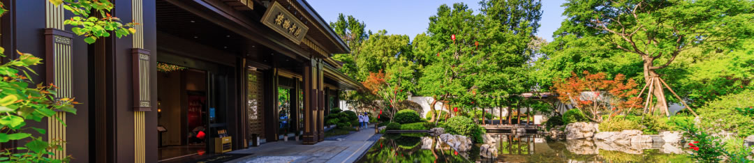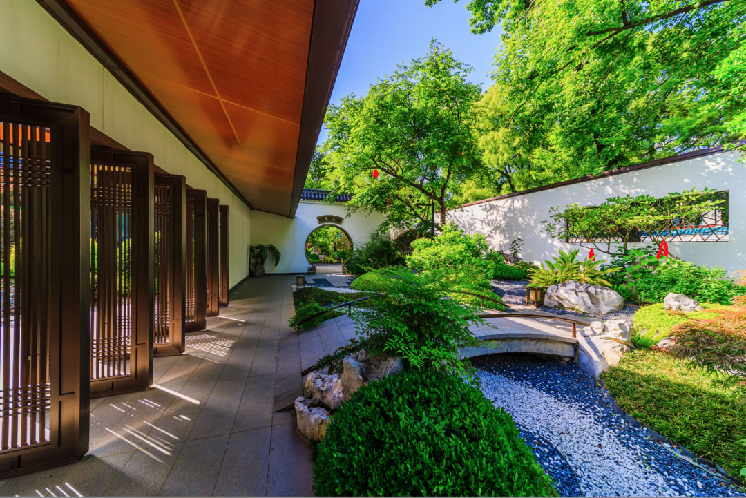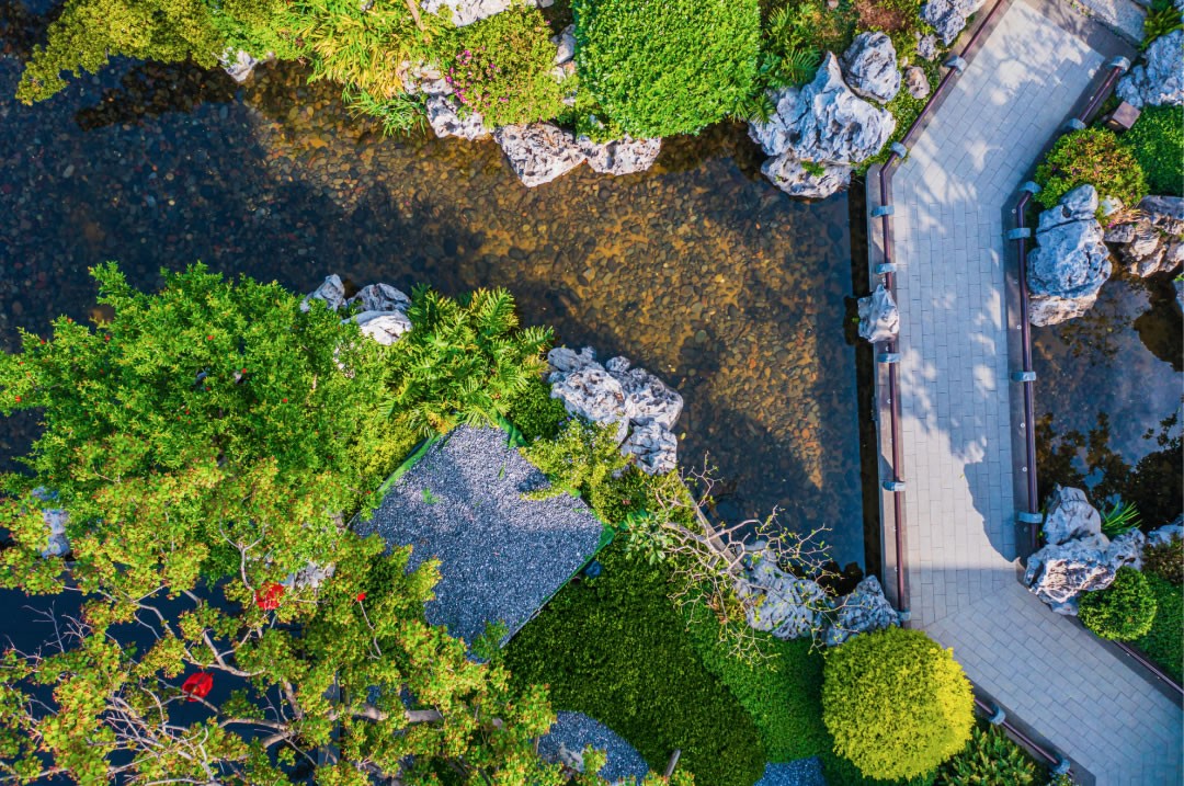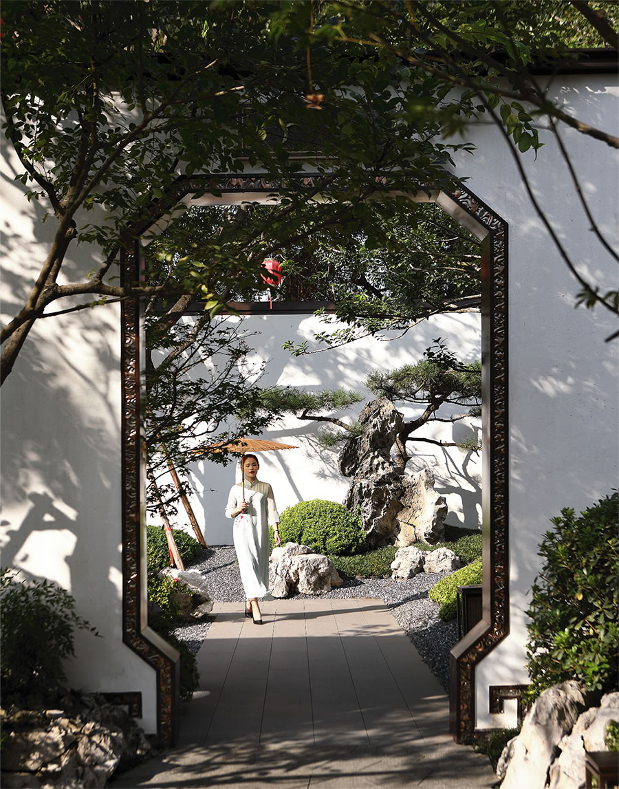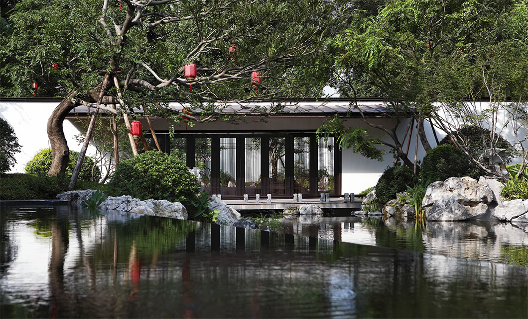 園林設計在傳承中國蘇州園林經(jīng)典和嚴肅規(guī)制的同時融入日本枯山水意境、精心考究照壁、水池、亭臺等元素,做到動靜相合、高地相輔、遠近融通。