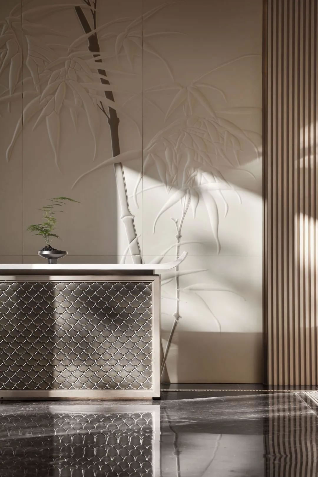 同時地面折射出空間的倒景,將空間內拔萃的竹林畫像、日耀山影以及金屬元素,共匯于一界之間。