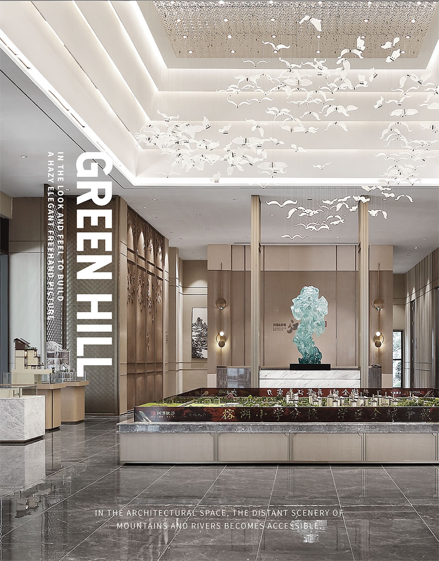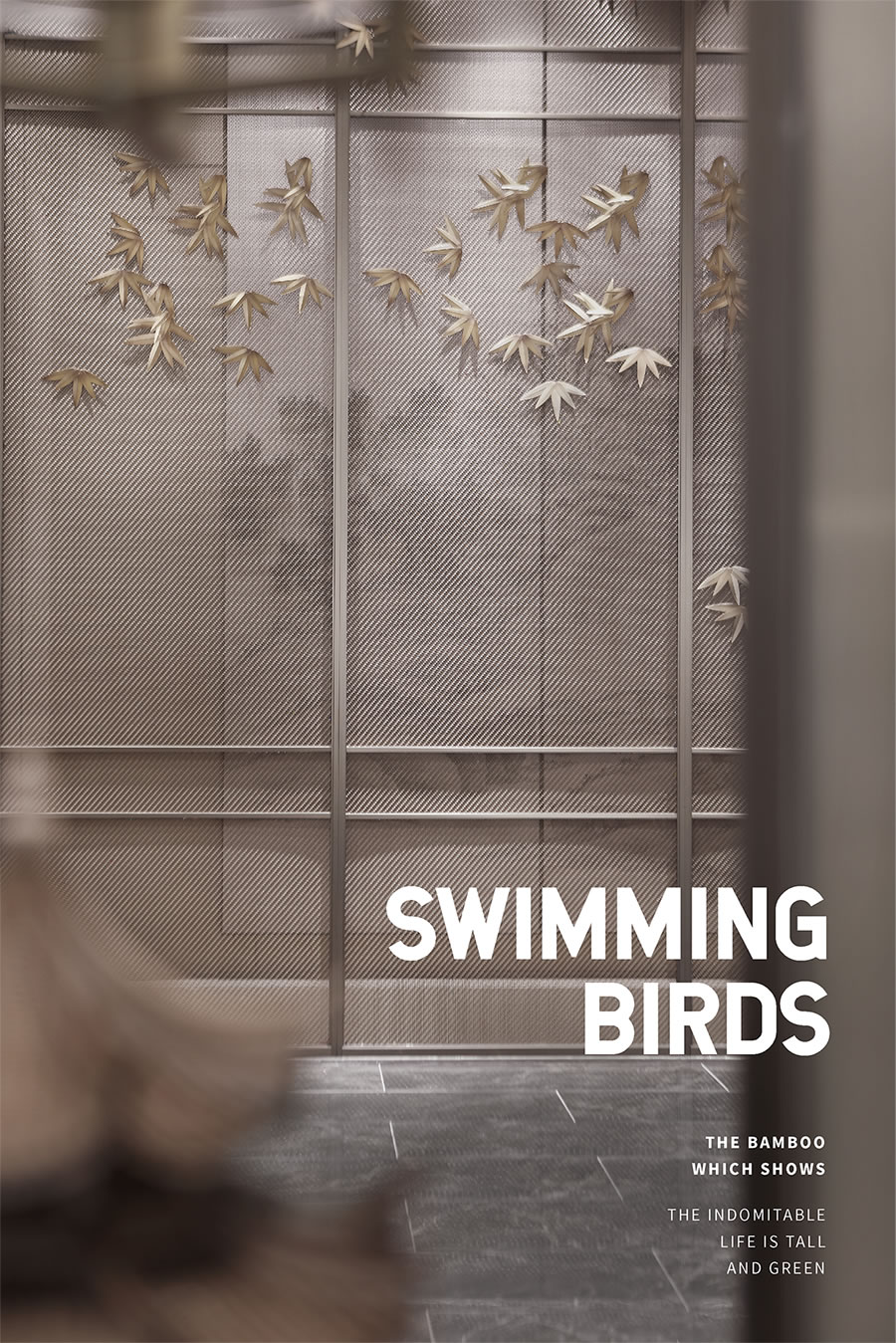 關于示范區(qū)天花構造上,江山樾巧借中式傳統(tǒng)古亭的設計理念,將頂梁堆疊伸展于天花之上,營造出一方天地。古亭下方,盤旋一方飛鳥,栩栩如生,似簾虛風清花竹靜,時有鸕鶿相對鳴來點破、一泓澄綠。