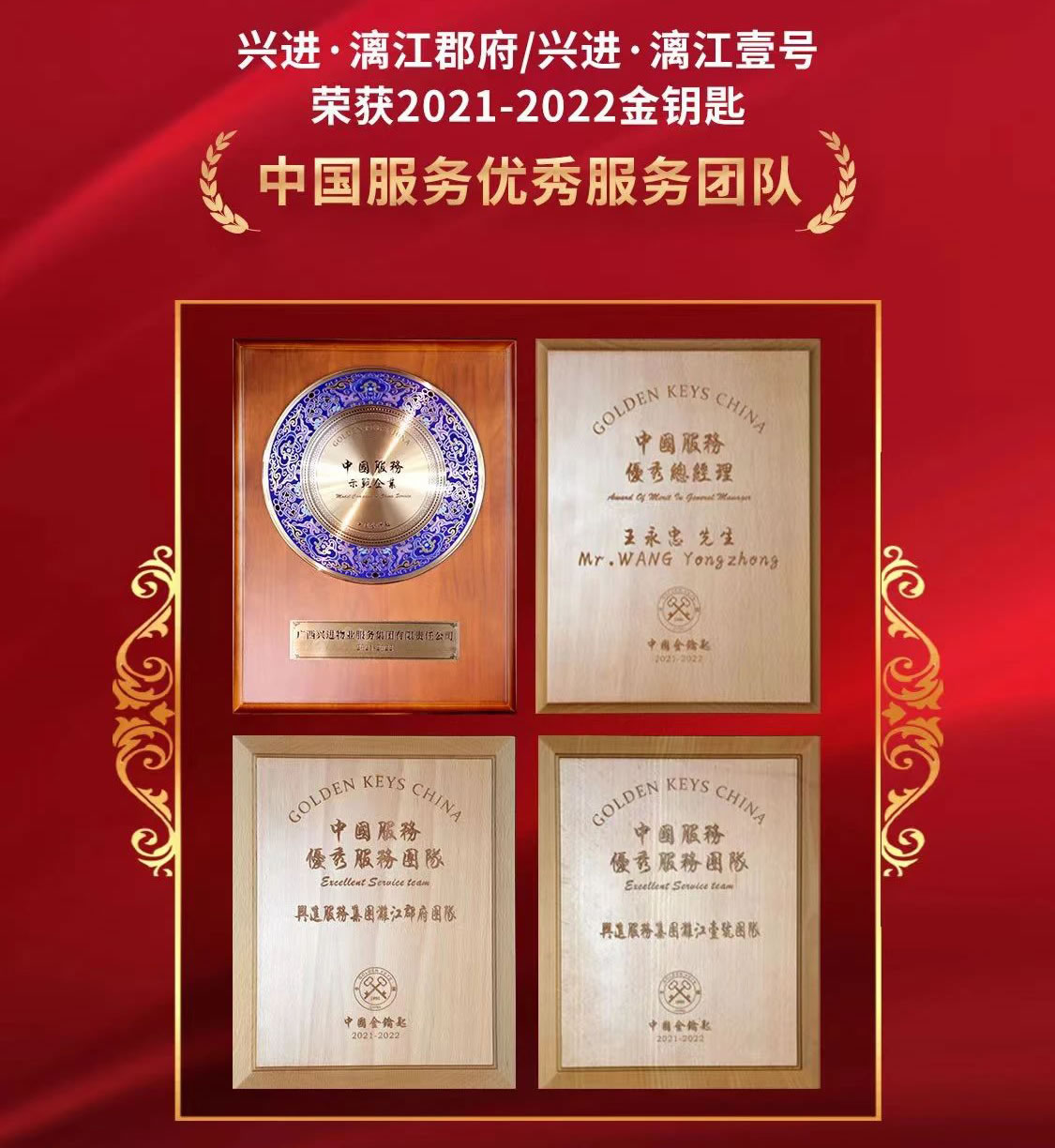 在年終收官之際,經(jīng)中國金鑰匙總部綜合評定,興進(jìn)服務(wù)集團(tuán)被評為2021-2022年度金鑰匙國際聯(lián)盟"中國服務(wù)示范企業(yè)",集團(tuán)總經(jīng)理王永忠先生獲"優(yōu)秀總經(jīng)理"稱號,興進(jìn)漓江郡府、漓江壹號獲"優(yōu)秀服務(wù)團(tuán)隊"榮譽(yù)稱號。